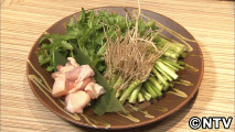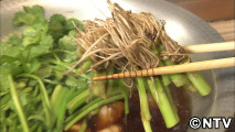 仙台せりと根っこ、鶏肉が入った鍋。4月上旬からは、露地栽培から水耕栽培のせりに切り替わるため、根っこの代わりに「仙台麩」と「三角油揚げ」の付いたセットになるそうです。