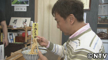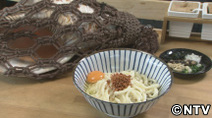 開店前に、お浄めのためにほら貝を吹く店主の山崎さん。10年前まで、奈良のお寺で修行していましたが、大好きなうどんの店を開こうと、独学でうどん作りを研究し、4年前にこの店をオープンしました。うどんのメニューは、自信を持っておススメできる10種類。中でも人気は、「チーズかまたま」。とろけたチーズが、フォンデュのようにうどんに絡まる一品です。