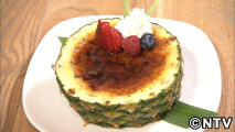 南国のリゾートをイメージしたレストランでは、ハワイアン・メニューが楽しめます。人気のパイナップル・ブリュレは、パイナップルをくり抜いた器に、甘みの強いゴールデンパインの実やカスタードなどを入れたトロピカルなスイーツ。
