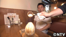 ナッツやバナナなどが入ったかき氷をイタリアンメレンゲでコーティングして作る「焼き氷」。火のついたラム酒をかければ、本当に炎が!