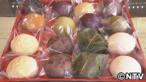 京都らしい、上品な生菓子を目指し、20年前に生まれたという「京おはぎ」。香り高い青森産のヨモギの新芽から、手作業で枝や茎を取り除き、煮出してミキサーにかけ、もち米と一緒に炊き込み、しっかりと混ぜあわせたら、栗を包み、それぞれの餡をまとわせれば完成。色とりどりの「京おはぎ」は全部で12種類。