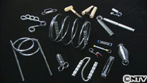 一本の金属を曲げて弾力を作り、強さは金属の太さや巻きの量で調節します。
