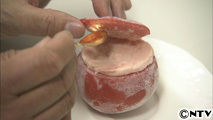果物の中身をひとつひとつ手作業でくり貫き、果肉をジェラート状にして、