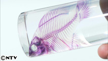 特殊な薬剤で軟骨を青、硬い骨を赤に染めながら徐々に体を透明化させます。