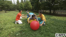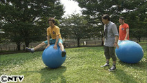 ボールの上で飛び跳ねたり、転がったりして、競います。