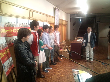 写真は、開演直前の「囲みインタビュー」の様子です。 中村蒼さん、倉科カナさん、井上正大さん、植原卓也さん、 崎本大海さんのいとこ5人たちと、演出の深作健太さんです!
