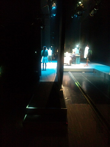 舞台の袖から、ちょっと本番を覗いてみました。 4場のバーモント州のお話、手前にいるのは倉科カナさんです。 今回はステージが移動する舞台なので、裏ではスタッフが大忙しです!