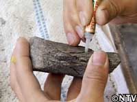 Žwœi‚Wj ’·‚³3.0 cm@‘¾‚³1.5 cm 134“ú–Ú‚Éì’ê‚ð”Œ@‚µ‚Ä‚¢‚½‘¾ˆê‚ªA15 cm‚قǂ̃mƒWƒ…[ƒ‹‚𔌩B ‹É‚ß‚Äd‚¢ƒmƒWƒ…[ƒ‹‚Å‚ ‚Á‚½‚ªA‚킸‚©15 cm‚قǂ̉ò‚Ì’†‚ÉA‘å—ʂ̜‚ªŠÜ‚Ü‚ê‚Ä‚¢‚é‚Ì‚ÅA—é–Øæ¶‚Ì“`‰Æ‚Ì•ó“Eƒ_ƒCƒ„ƒ‚ƒ“ƒhƒJƒbƒ^[‚ÍŽg‚¦‚È‚¢B ‚»‚±‚Å_“c‘àˆõ‚ÍAƒGƒAƒ`ƒ[ƒ‹‚ðŽg‚¢AƒmƒWƒ…[ƒ‹•\–ʂɋ؂ð‚P–{‚¸‚‚ݞ‚ނ悤‚É‚µ‚ÄA•êŠâ‚ðí‚Á‚Ä‚¢‚Á‚½B ‚±‚̂悤‚ÉA‰»Î‚ª–§W‚µ‚Ä‚¢‚éꊂðwƒ{[ƒ“ƒxƒbƒhx‚ƌĂÔc‚Æ—é–Øæ¶‚É‹³‚í‚Á‚½Biƒ{[ƒ“œj |