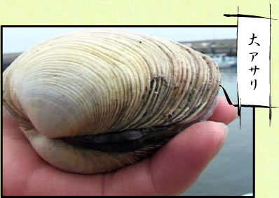 大アサリの正式名称はウチムラサキ貝。冬から早春が旬。アサリと混同されがちだが、殻の内側が濃い紫色なのが特徴。知多半島の先に浮かぶ日間賀島一帯や、知多半島の河和などでは、海藻の多い岩場や良質の砂泥に恵まれた海底のためか、直径5センチ以上、10cmほどもある大アサリが獲れる事で知られる。ただし水深10mぐらいの海底に生息する貝なので、素人ではまず獲ることができない。