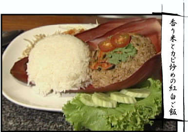 バナナの花に白米とカピ炒飯を2色で盛り付け完成。