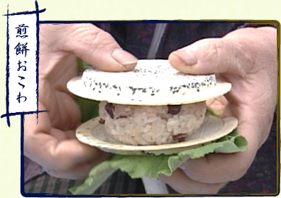 青森県南部地方の特産である「南部せんべい」で炊き立ての赤飯を挟んだもの。「小昼」と呼ばれる農作業の小休止の時に、仕事を手伝ってくれた人に振る舞って食べられていた。