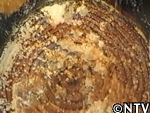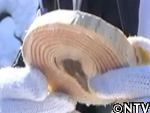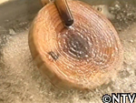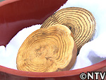 間伐材を松川温泉の酸性泉に浸け組織に空洞をつくり石鹸成分を含ませて作る。浸ける温泉がアルカリ泉だと木の繊維が全部溶けてしまい、パルプになってしまうので、酸性の松川温泉ならではの利用法と言える。 |