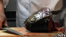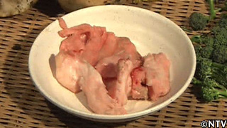 ①アカネマスの頭をブツ切りにして、湯通しをする。