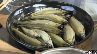 ②片栗粉をまぶしたアユを油で揚げて、から揚げの完成。
