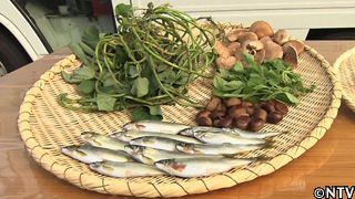 秋の味覚をふんだんに使用した3品。1品目は子持ちアユ、栗を使った『子持ちアユのオリーブオイル焼きとから揚げ 栗添え』、2品目は、『シイタケとサツマイモのツルのきんぴら』、3品目は、渋柿を使った『渋柿のお好み焼風』。素材の味を活かしたメニューとなった。