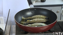 ①フライパンでアユをオリーブオイルと塩で焼いて、塩焼きの完成。