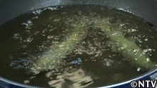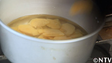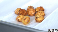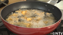 ②煮込んだ渋柿を片栗粉でまぶし、油で揚げる。