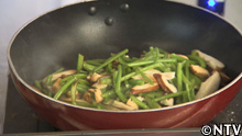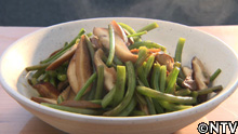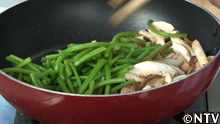 ①切ったシイタケ、サツマイモのツルをゴマ油で炒める。
