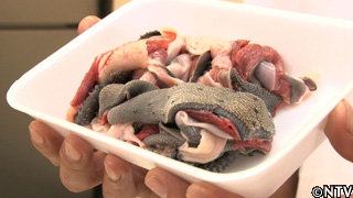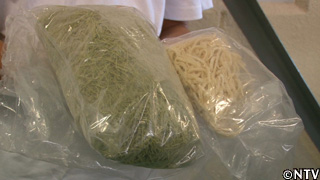 わかめなどを練りこんだ地元名物のわかめそうめんやわかめうどんの製造過程で出てしまう、麺が折れたり、厚みが規定に満たしていないため処分されてしまうものと、その途中で出る切れ端部分を分けて頂いた。