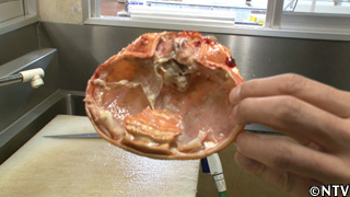 このお店では、カニの重さが軽くカニ味噌が入ってないと思われる物は、足だけ切り落として販売しているため、殻の部分は捨ててしまう。