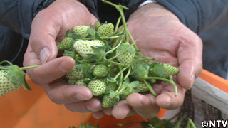 こちらでは、甘く、大きなイチゴに育てるために、一枝に5つ以上実がついていたら6つ目を摘果(間引き)している。