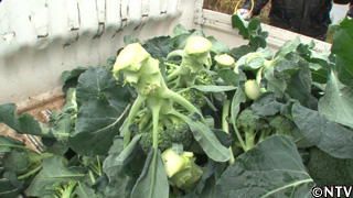 茎を長めに収穫したブロッコリーは、葉をその場で取り除き、奥の小屋で16㎝の出荷サイズに茎を切り落とす。切り落とした茎は処分されるということで、2日前に切り落とした茎20個ほどを分けて頂いた。