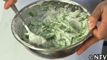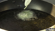 讃岐うどんの本場、香川県で作ったのは、太刀魚、ニラで作った2種類の天ぷらと、さっぱりとした酸味がアクセントのダイダイ、さらに水菜の4種類のトッピングを加えた讃岐うどん。 そして、讃岐うどんの生地を油で揚げ、栗の欠片を加えて作った特製ソースをかけた揚げ菓子。 本場の味を十二分に堪能できるメニューとなった。