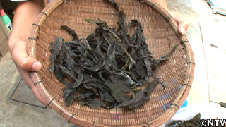 ワカメは収穫後、1日天日干しするが、乾燥することによって先端の古い部分の色が焼けた様に薄くなってしまうので捨ててしまう。