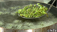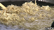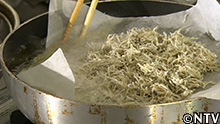 獲れたてのカタクチイワシの子を、セイロと呼ばれる木枠の網の上に広げ釜の中へ入れ、6分程茹でる。