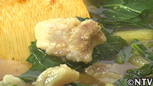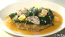 パリパリに揚げた麺の上に、野菜や魚介類などで作ったあんをかけた、長崎名物の皿うどんをヒントに作った0円料理。 キャベツと、ひじきとシイラのすり身で作った特製かまぼこを入れたあんを、カリッと油で揚げたちりめんにかけた。 城島と長瀬のアイディアが光る一品。