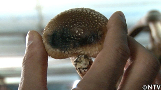菌床栽培用のブロックを鉄の棚に並べて育てているが、生長する際に、棚と接触して黒く変色してしまったシイタケを頂いた。