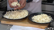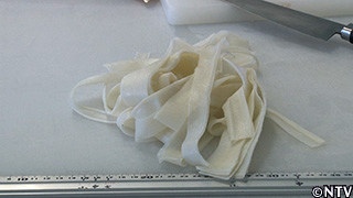 2.《麺作り&天ぷら粉づくり》 氷見うどんの切れ端を長い部分と細かい部分に分ける。 |