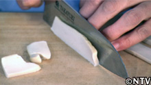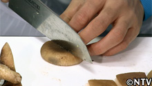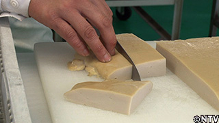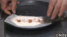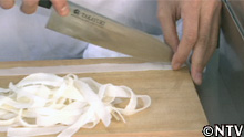2.《具材作り 1》ブリが入ったかまぼこは、薄く長方形に切り、中央に穴を開け、ねじりコンニャク風にする。 |