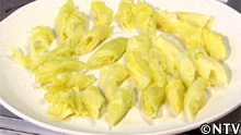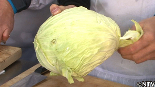 3.《具材作り 2》キャベツを茹でて柔らかくしたものを巻いて、長ネギに見立てる。 |