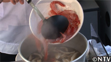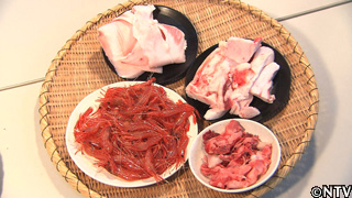 1.エビの殻を剥き、火で炙った後に鍋に入れて出汁をとる。 |