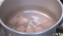 2.豚の脂は一口大に切って塩で揉み、しばらく置いた後に茹でる。 シイタケは薄切りにする。 |