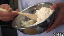 4.蒸かした長芋をマッシャーで潰し、そぼろにした能登牛と牛脂を加えて混ぜ合わせる。 混ぜ合わせたものを俵状にする。 |