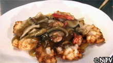 3.エビの殻で取った出汁に、しょうゆ、酒、オイスターソースで味をつける。 豚の脂、殻を剥いたエビ、しいたけを加え一煮立ちさせる。 最後に片栗粉を入れとろみをつけ、火を止めた後に、香り付けのごま油とこしょうを入れ、あんの完成。 |