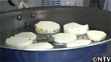 1.長芋の皮を剥き、輪切りにし、フライパンで蒸かす。 |