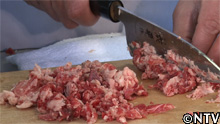 2.能登牛の切れ端と能登牛の脂を細かく刻みミンチ状にする。 |