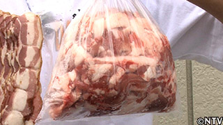頂いたのは、薫製機で燻す際などにかけるフックの跡がついてしまったベーコン、骨がついたスジ肉、規格外のハム。