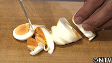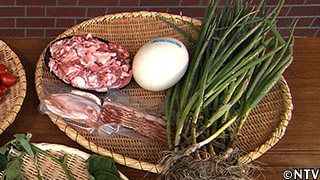 1.<具材> キュウリ、トマト、ハムや、茹でたシイタケを薄く切り、ゆで卵は輪切りにする。 ネギは、白い部分を細く切って白髪ネギにする。 ナスは縦に半分に切り、細切りにしたものを素揚げに。 |