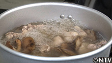 2.<タレ1> 豚のスジ肉についていた脂身とシイタケを鍋で煮て、出汁をとる。 味が出たらシイタケと豚を取り除く。 |
