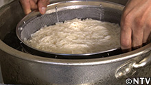 4.<麺> 細うどんを強く揉み、中華麺のように縮れを作る。 それを沸騰した鍋にいれ、柔らかくなるまで茹でる。 茹でた麺は氷水にさらしてよくしめる。 |