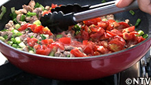 1.オリーブオイルで細かく切ったスジ肉を炒め、そこに小口切りにしたネギ、細かく切ったトマトの順番で入れて、塩・粗挽きコショウで味をつける。 |