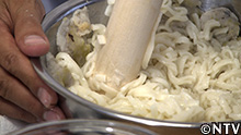 2.<生地1> 茹でて皮をむいた里芋をすり潰し、そこに茹でたうどんを加えてすり潰しながら混ぜる。 繋ぎに小麦を足し、さらに混ぜる。 |
