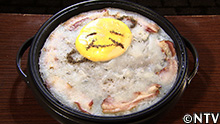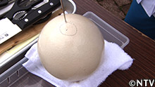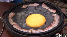 2.ベーコンをホットプレートの周りで焼き、真ん中に1で割ったダチョウの卵を入れ、蓋をして20分焼く。 |