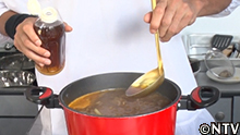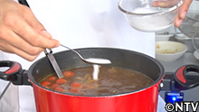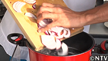2.岩ガキのダシの出たスープにタマネギを刻んで加える。 枝豆を沸騰したお湯で茹でる。 |