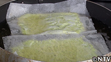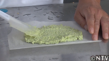 5.茹でた枝豆を取り出し、フードプロセッサーでペースト状する。 オーブンシートに広げ、油へ。 |