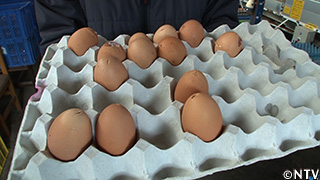 卵の選別は殻の硬さを1つずつ指で弾くようにしてチェックしている。